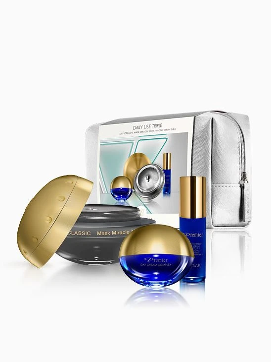 The ultimate triple kit for daily use nourishes, lifts, brightens and fights the aging process for a complete age defying treatment.